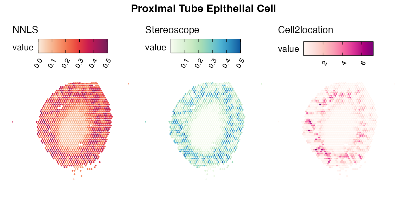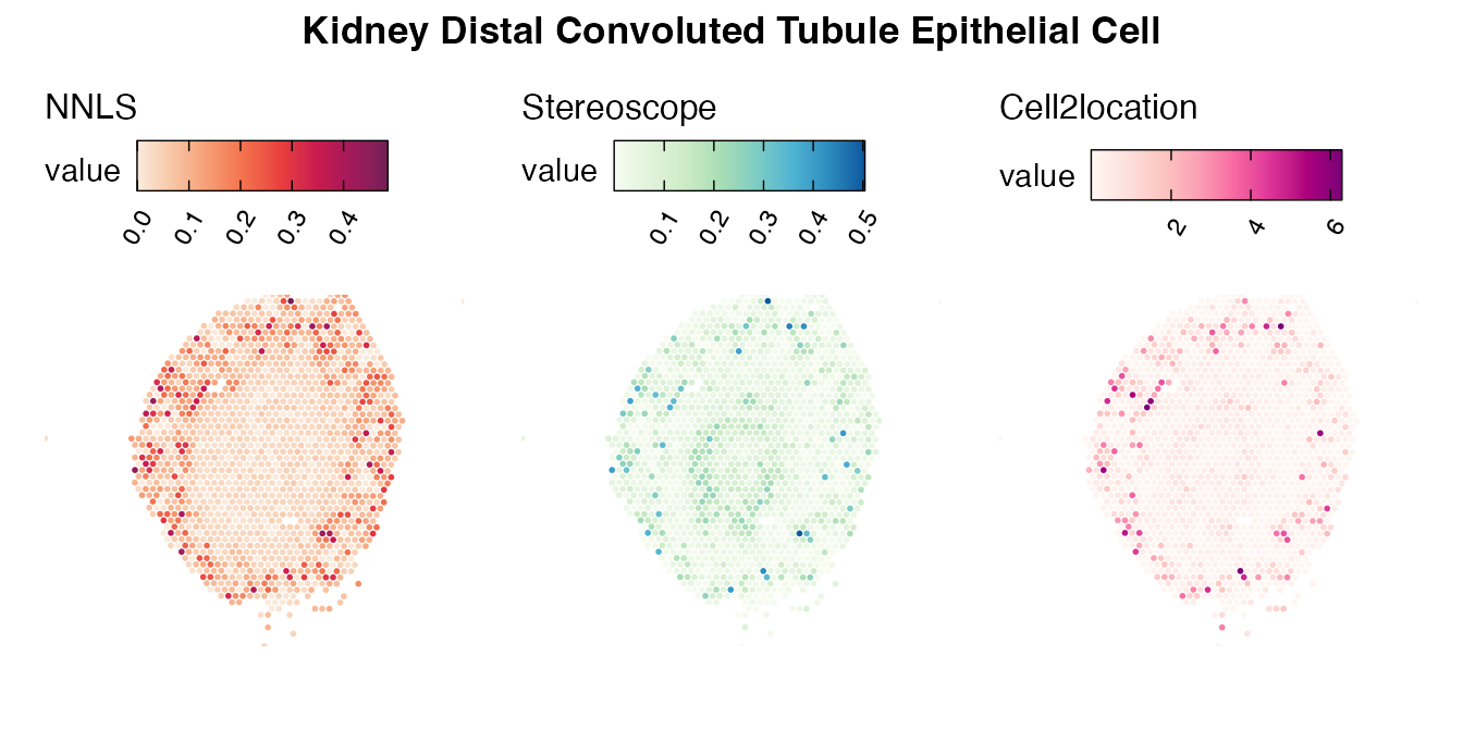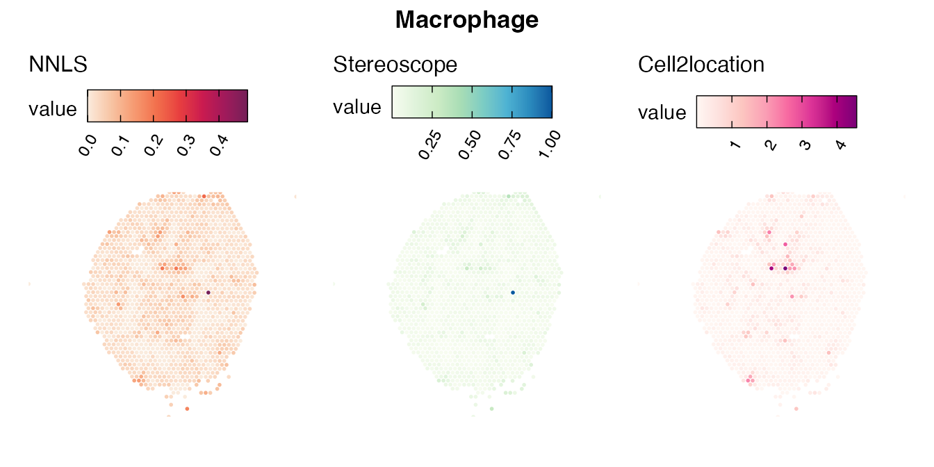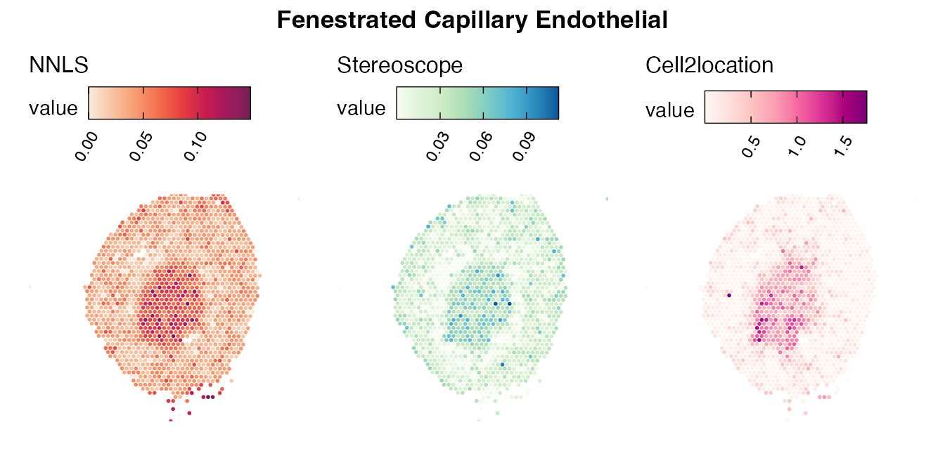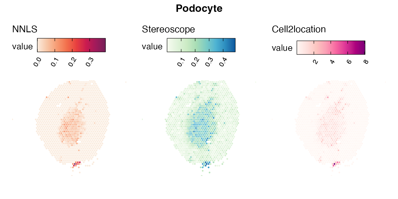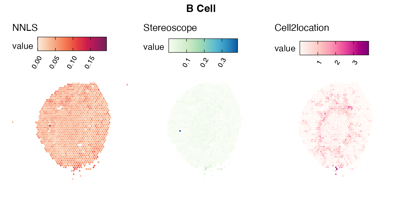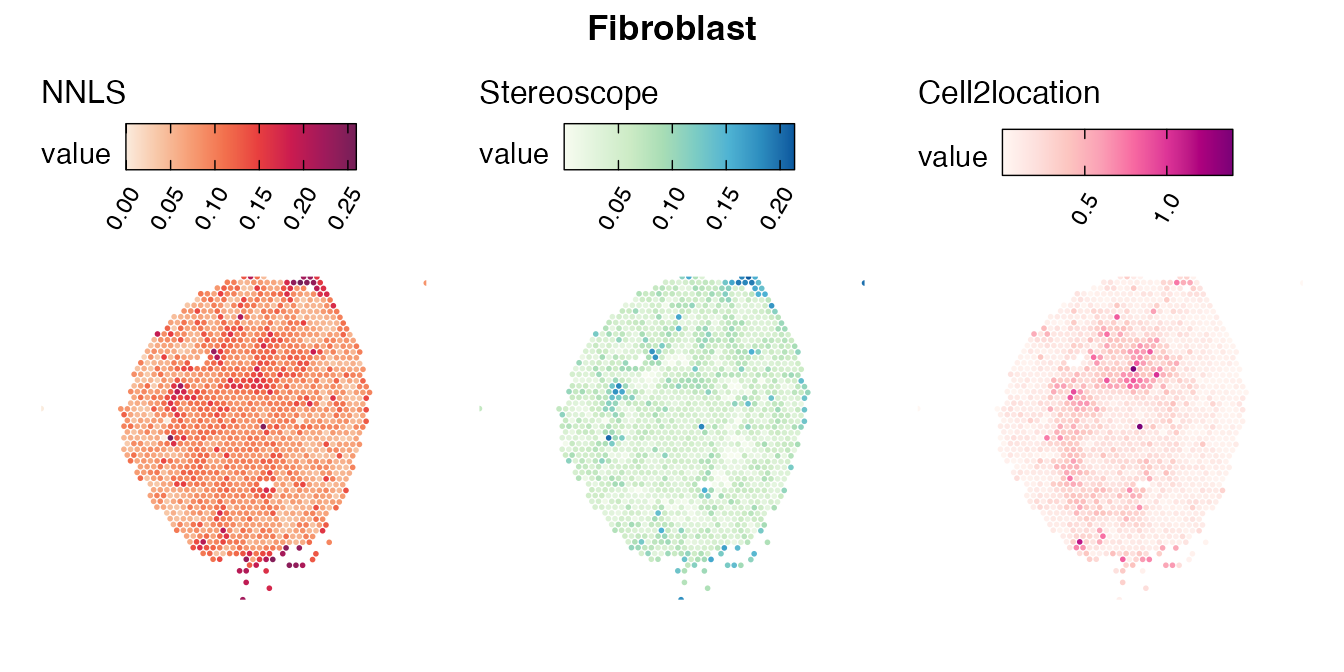 The same Visium and reference scRNA-seq data sets were used as input for all cell type deconvolution methods tested. The code displayed in the Cell type mapping with NNLS vignette was used to produce the NNLS mapping results, while stereoscope and cell2location were run in python on high-performance computing servers using default parameter settings.
