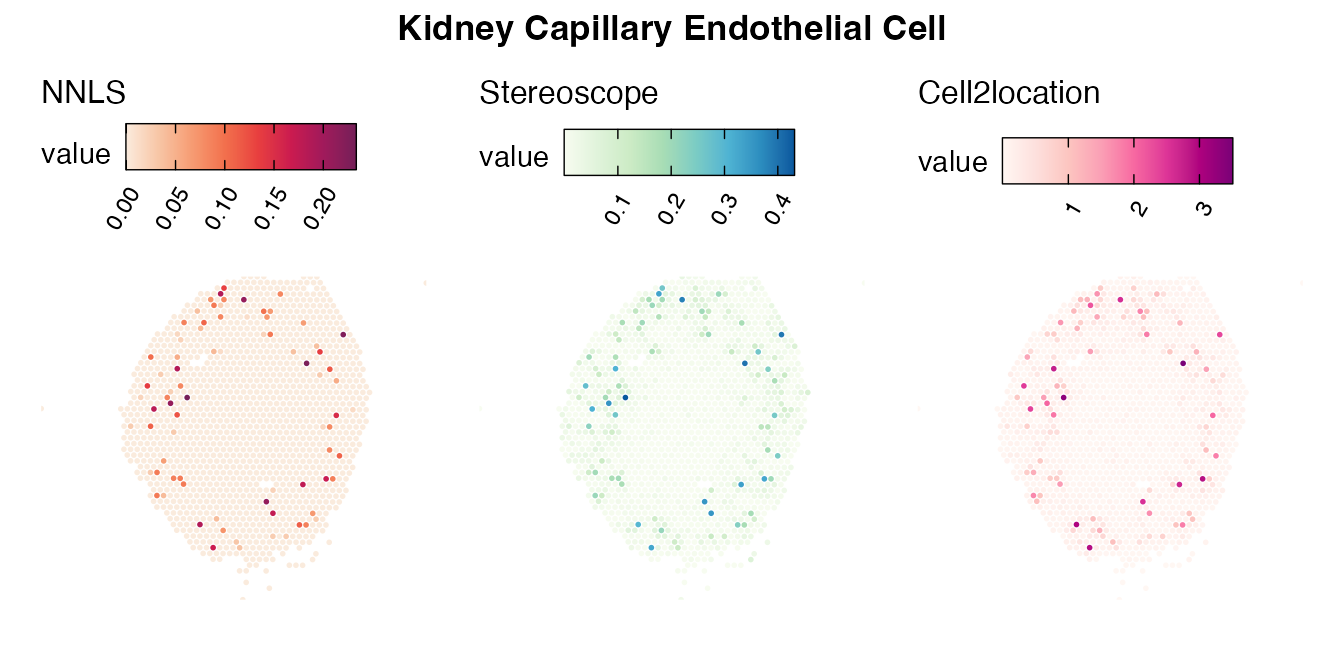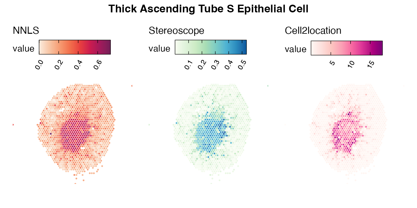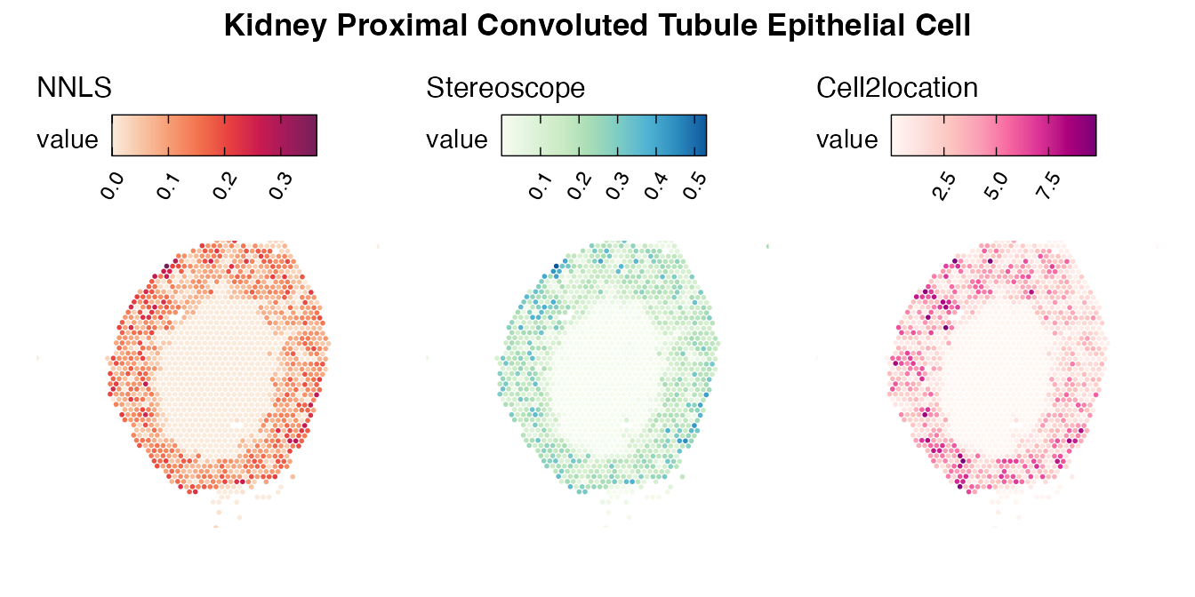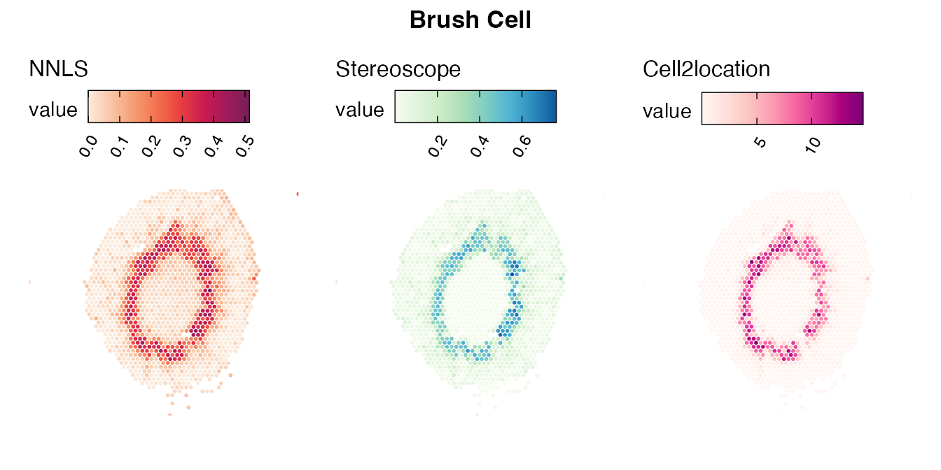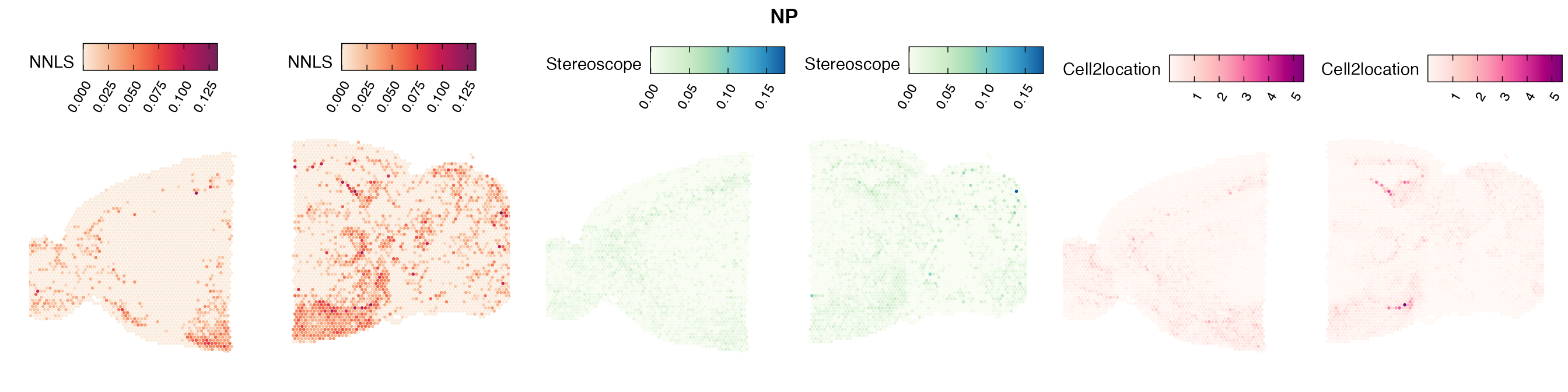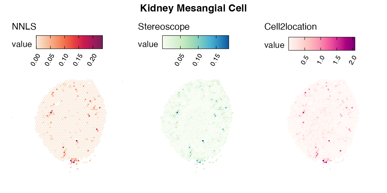The same Visium and reference scRNA-seq data sets were used as input for all cell type deconvolution methods tested. The code displayed in the Cell type mapping with NNLS vignette was used to produce the NNLS mapping results, while stereoscope and cell2location were run in python on high-performance computing servers using default parameter settings.