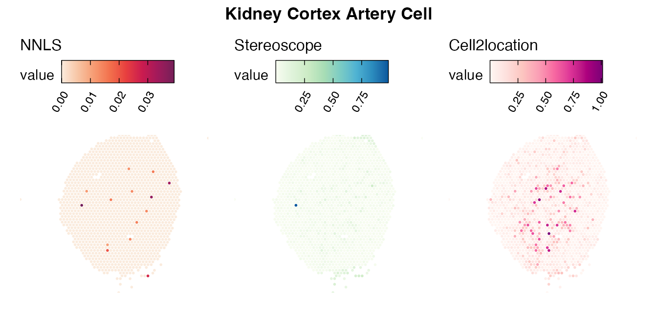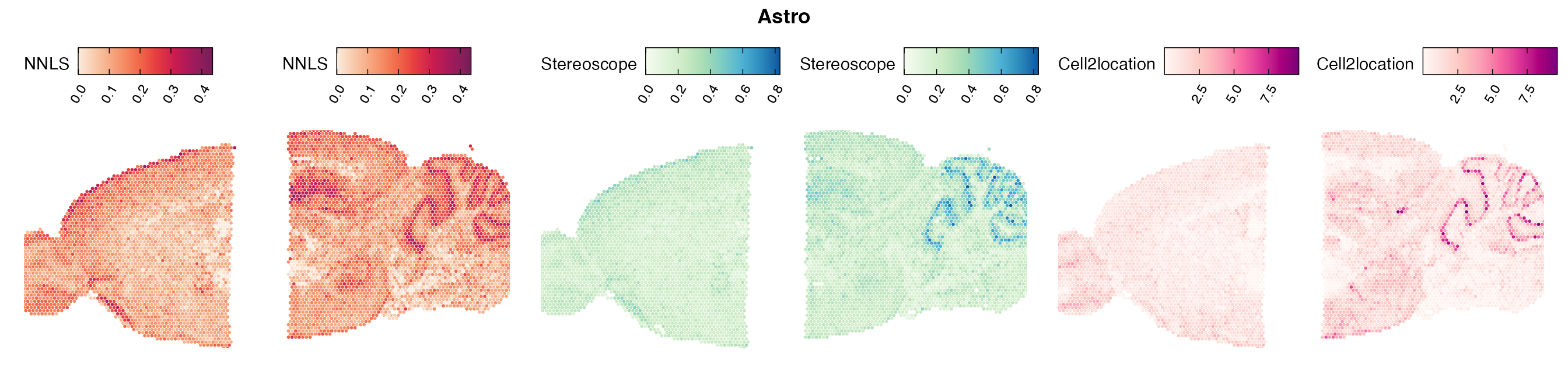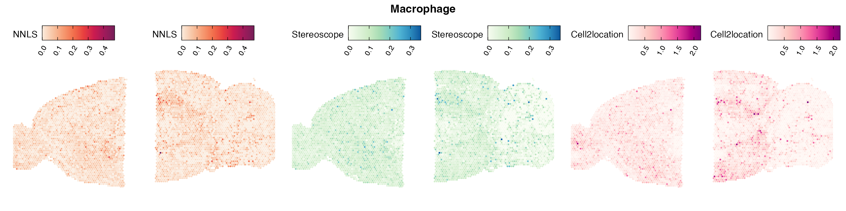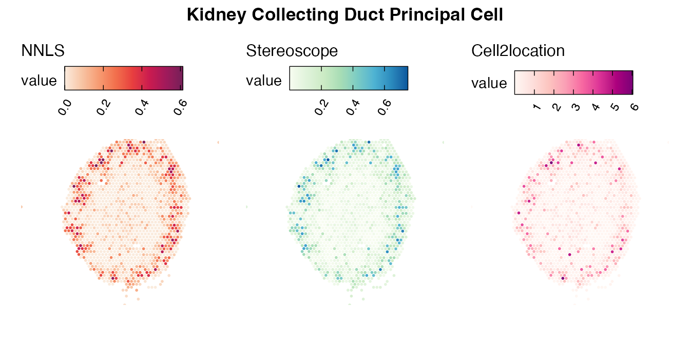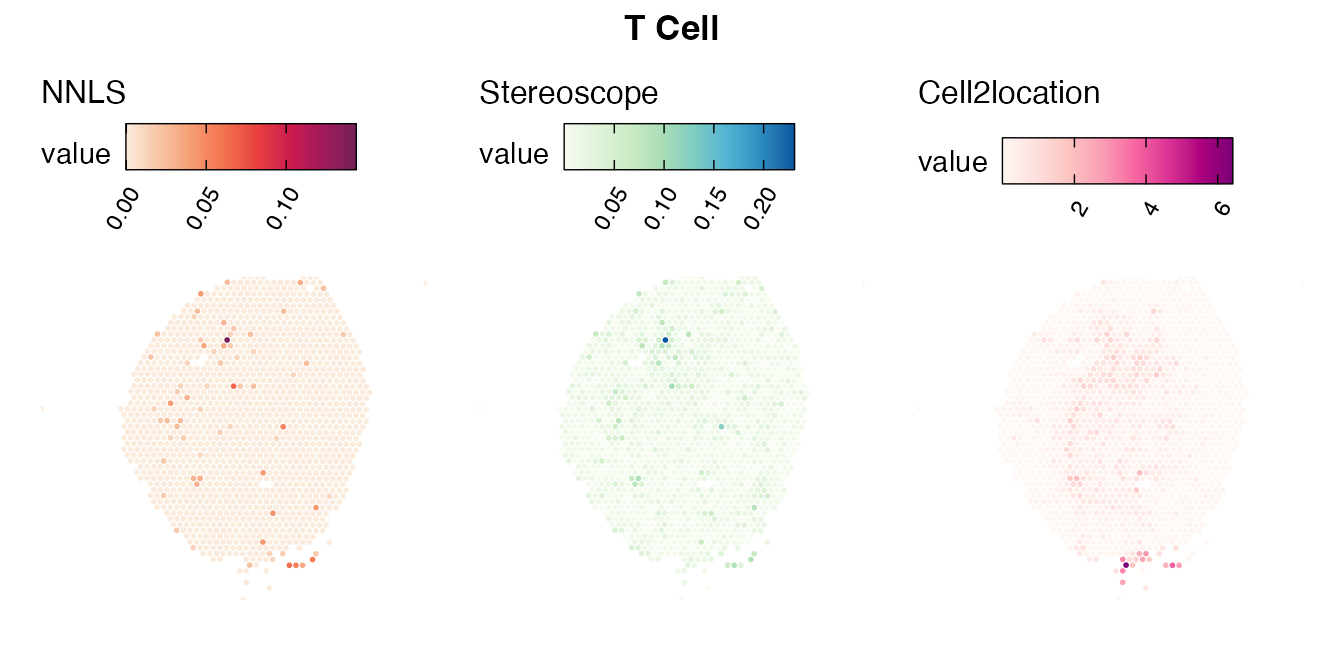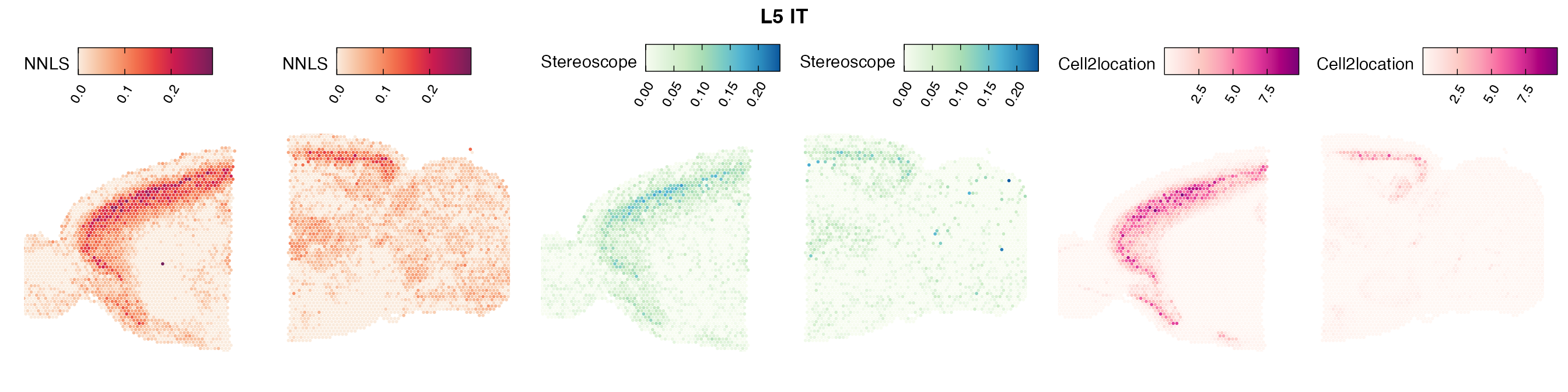 The same Visium and reference scRNA-seq data sets were used as input for all cell type deconvolution methods tested. The code displayed in the Cell type mapping with NNLS vignette was used to produce the NNLS mapping results, while stereoscope and cell2location were run in python on high-performance computing servers using default parameter settings.