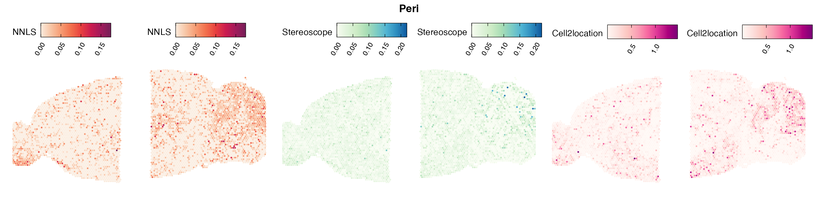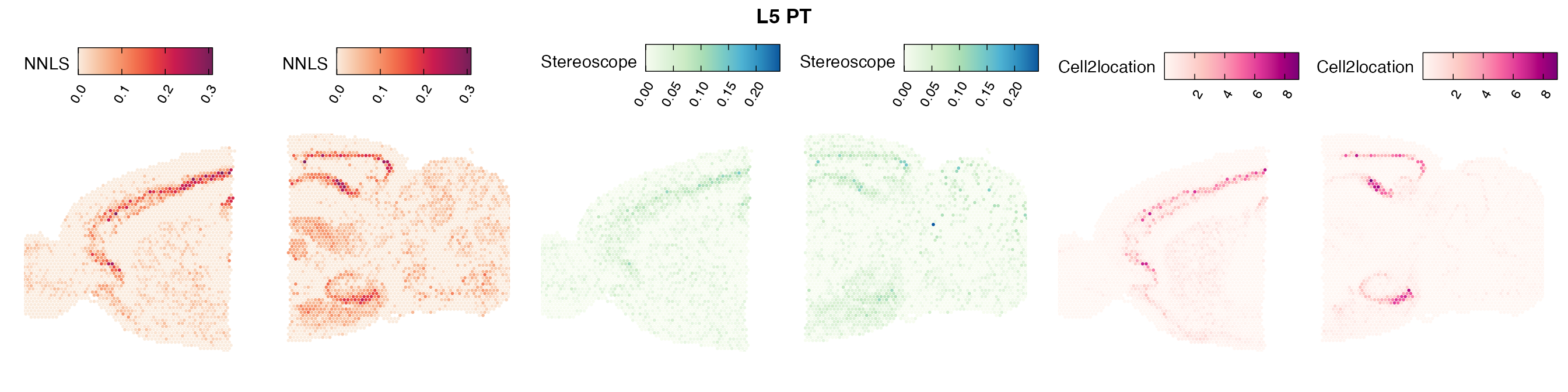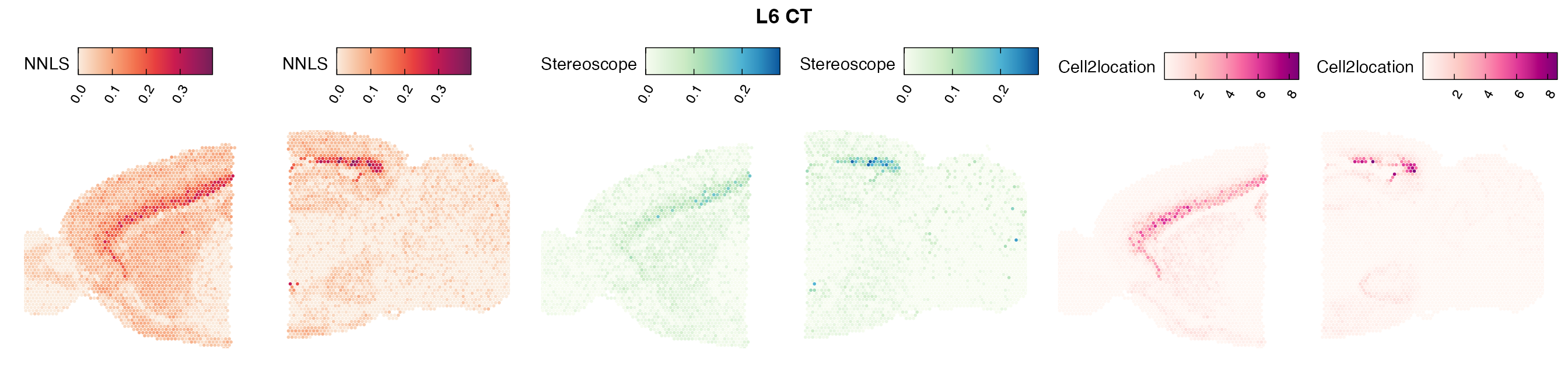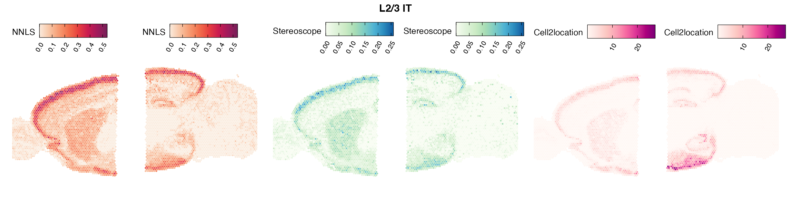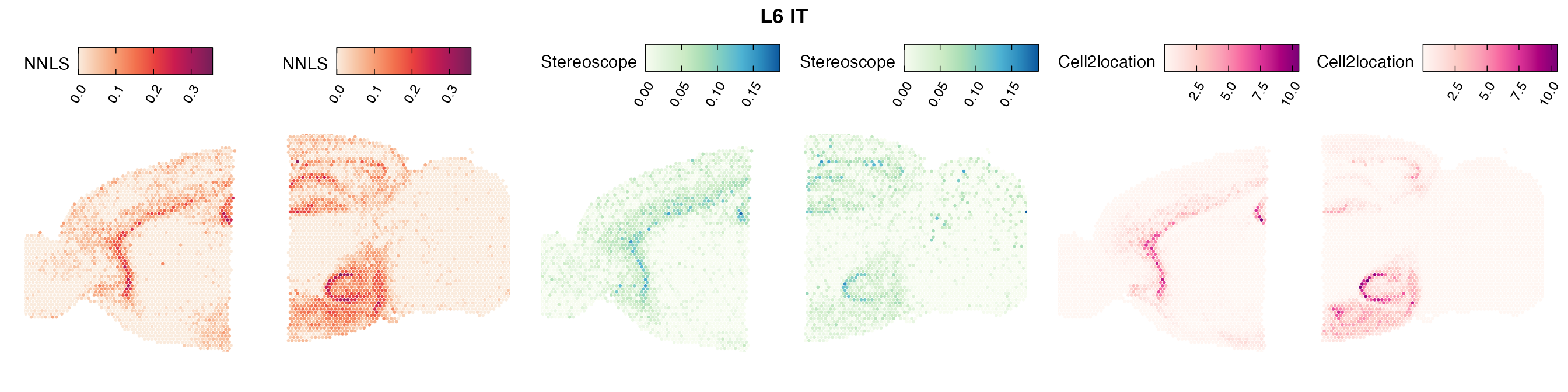 The same Visium and reference scRNA-seq data sets were used as input for all cell type deconvolution methods tested. The code displayed in the Cell type mapping with NNLS vignette was used to produce the NNLS mapping results, while stereoscope and cell2location were run in python on high-performance computing servers using default parameter settings.