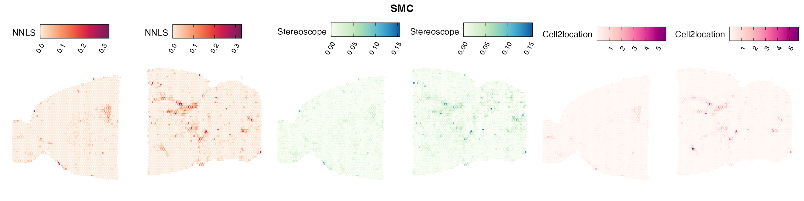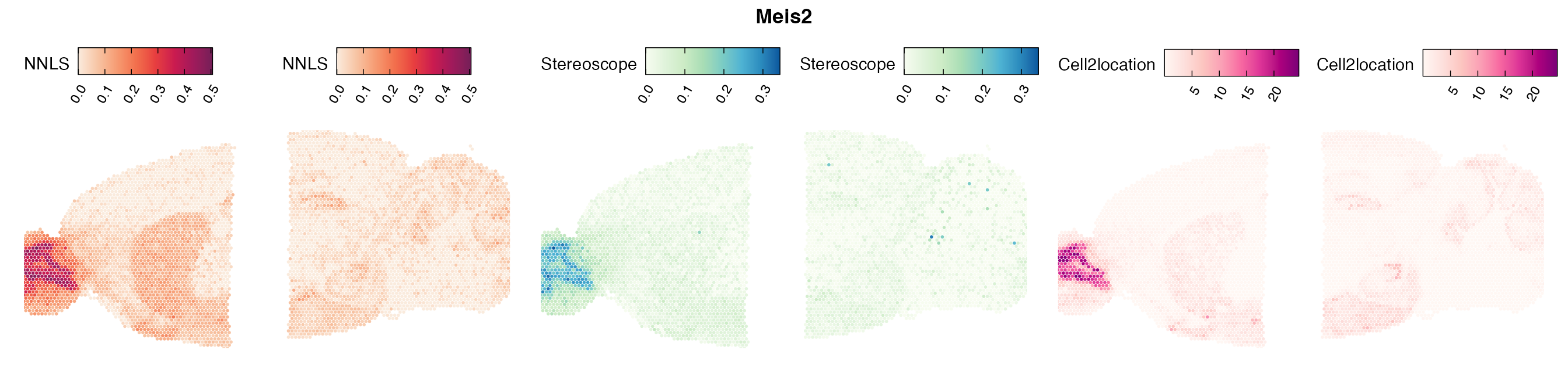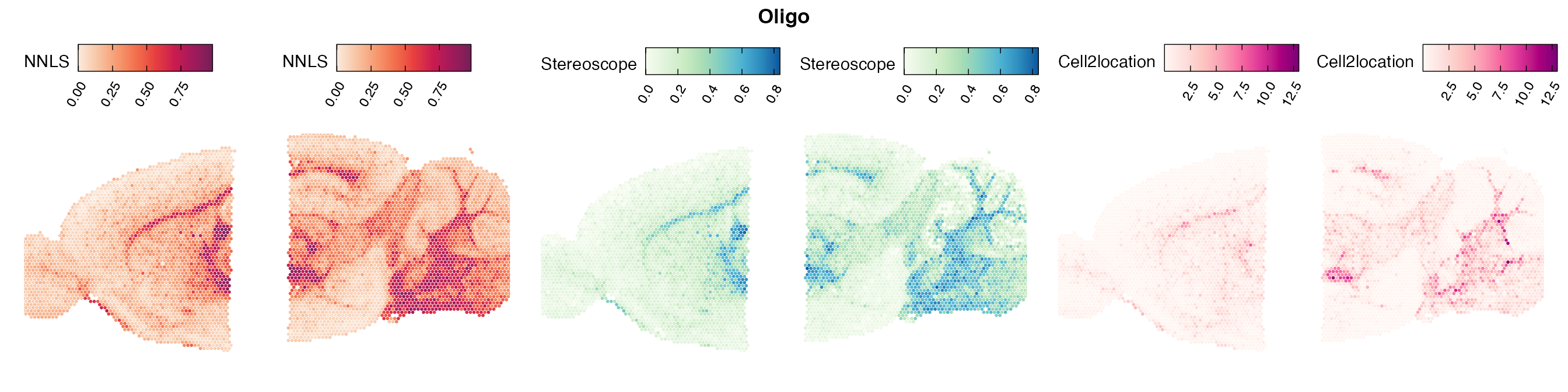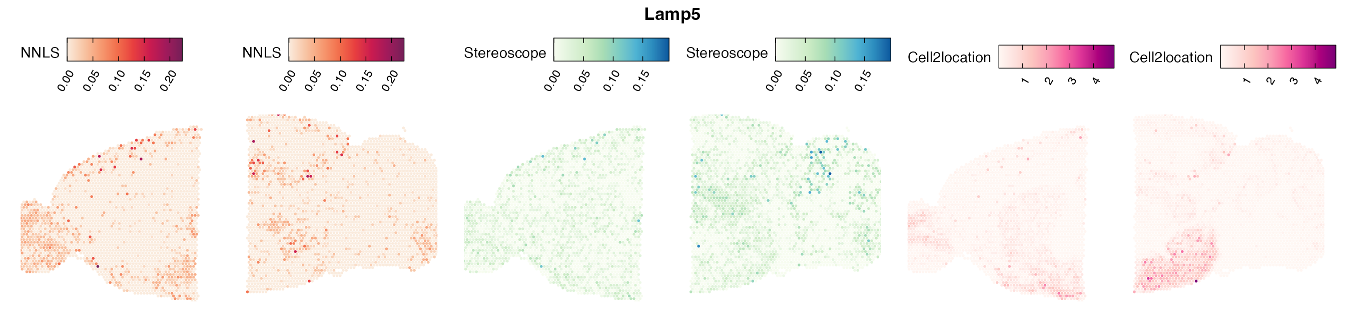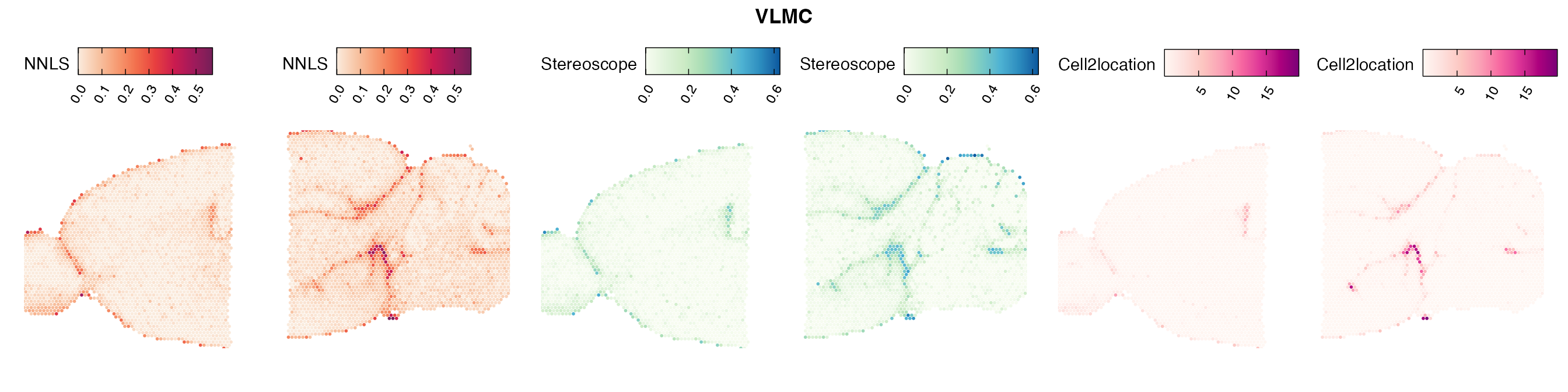 The same Visium and reference scRNA-seq data sets were used as input for all cell type deconvolution methods tested. The code displayed in the Cell type mapping with NNLS vignette was used to produce the NNLS mapping results, while stereoscope and cell2location were run in python on high-performance computing servers using default parameter settings.