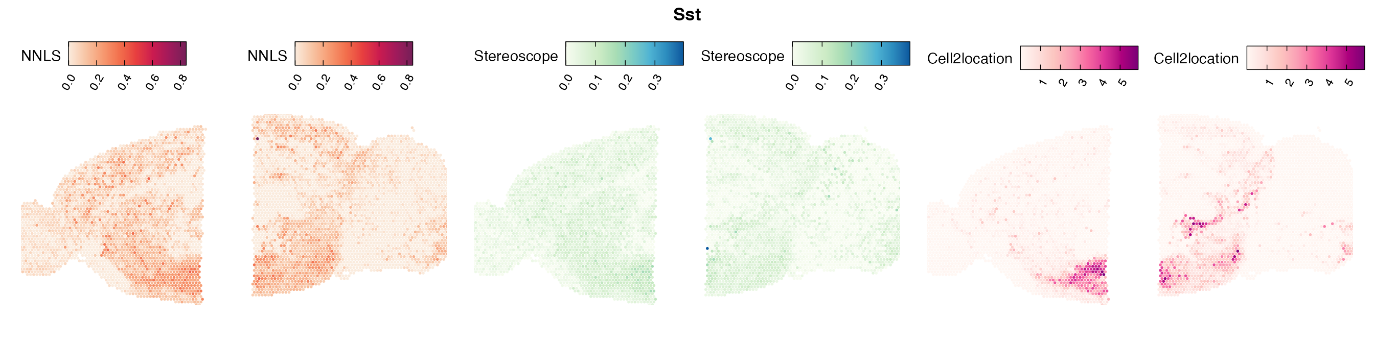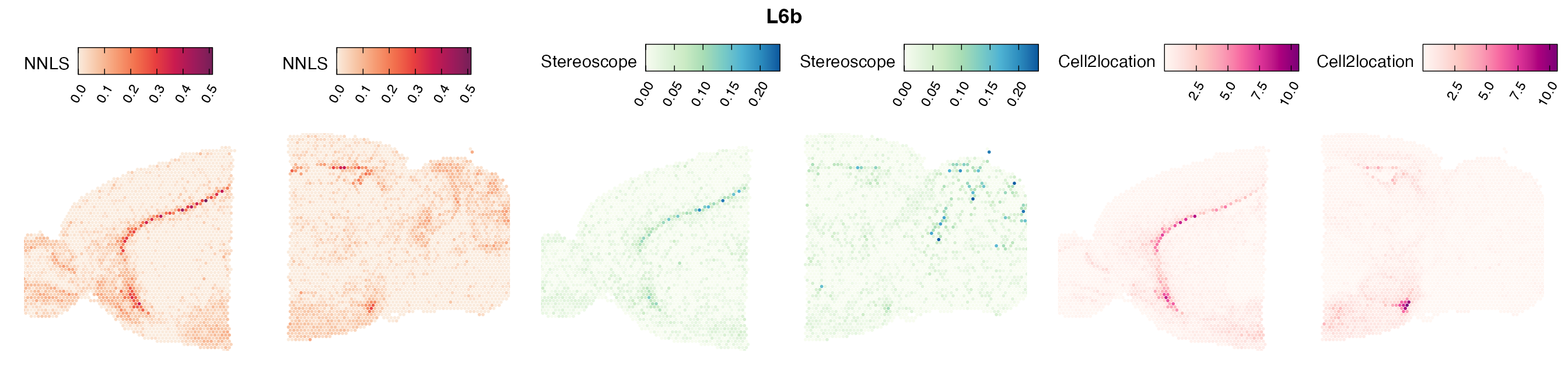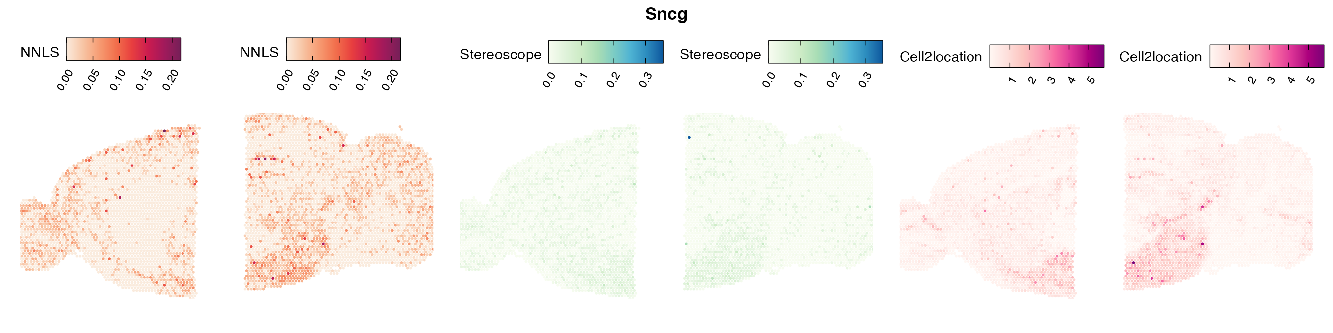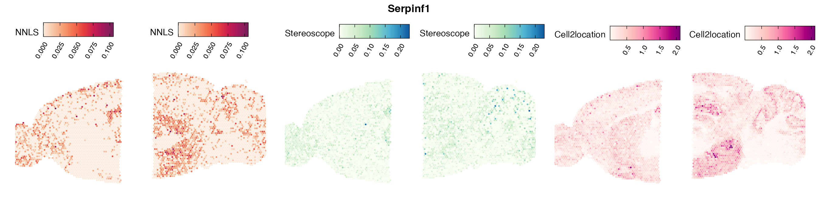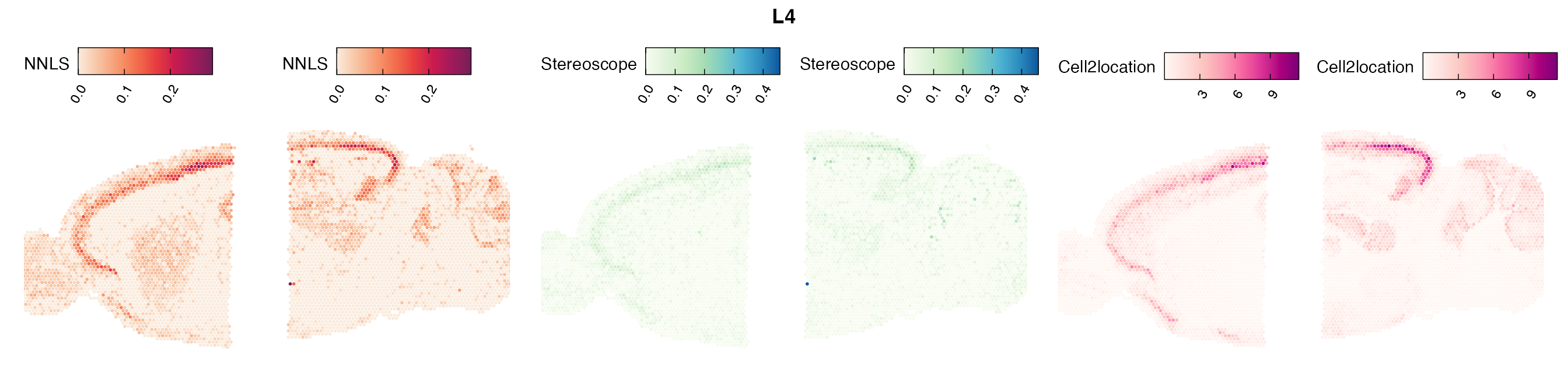 The same Visium and reference scRNA-seq data sets were used as input for all cell type deconvolution methods tested. The code displayed in the Cell type mapping with NNLS vignette was used to produce the NNLS mapping results, while stereoscope and cell2location were run in python on high-performance computing servers using default parameter settings.
