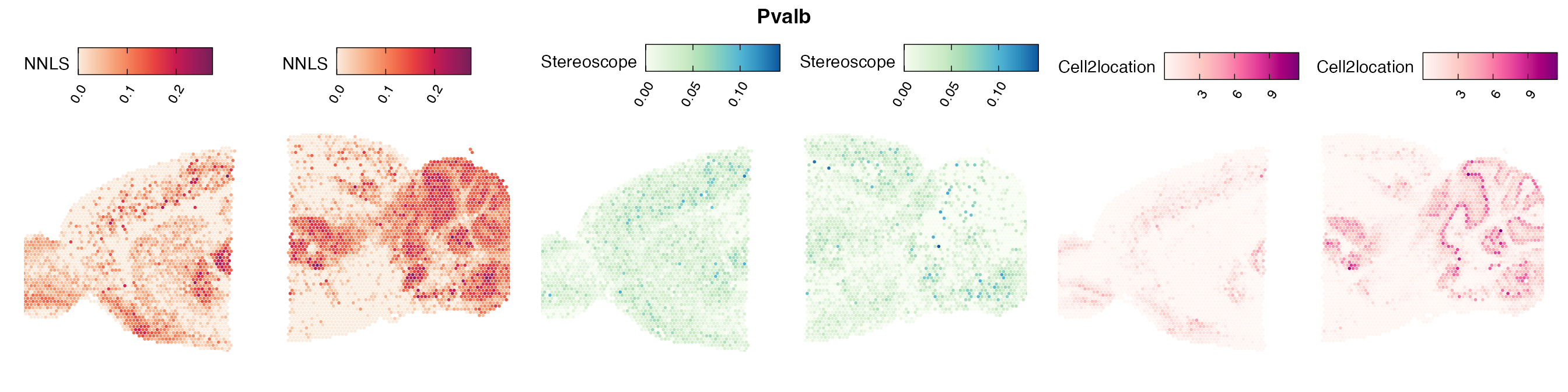 Here, we can for instance more easily spot a large difference in the correlation values between the NNLS:stereoscope an NNLS:cell2location for Pvalb cells, demonstrating an example of how different cell type mapping algorithms can perform drastically different despite the same input.