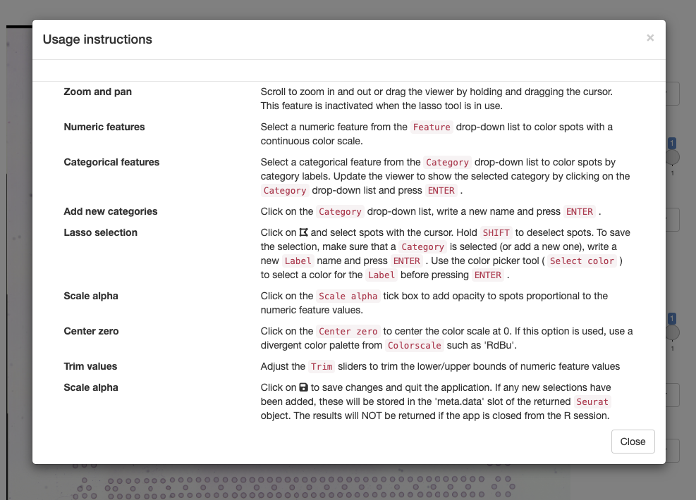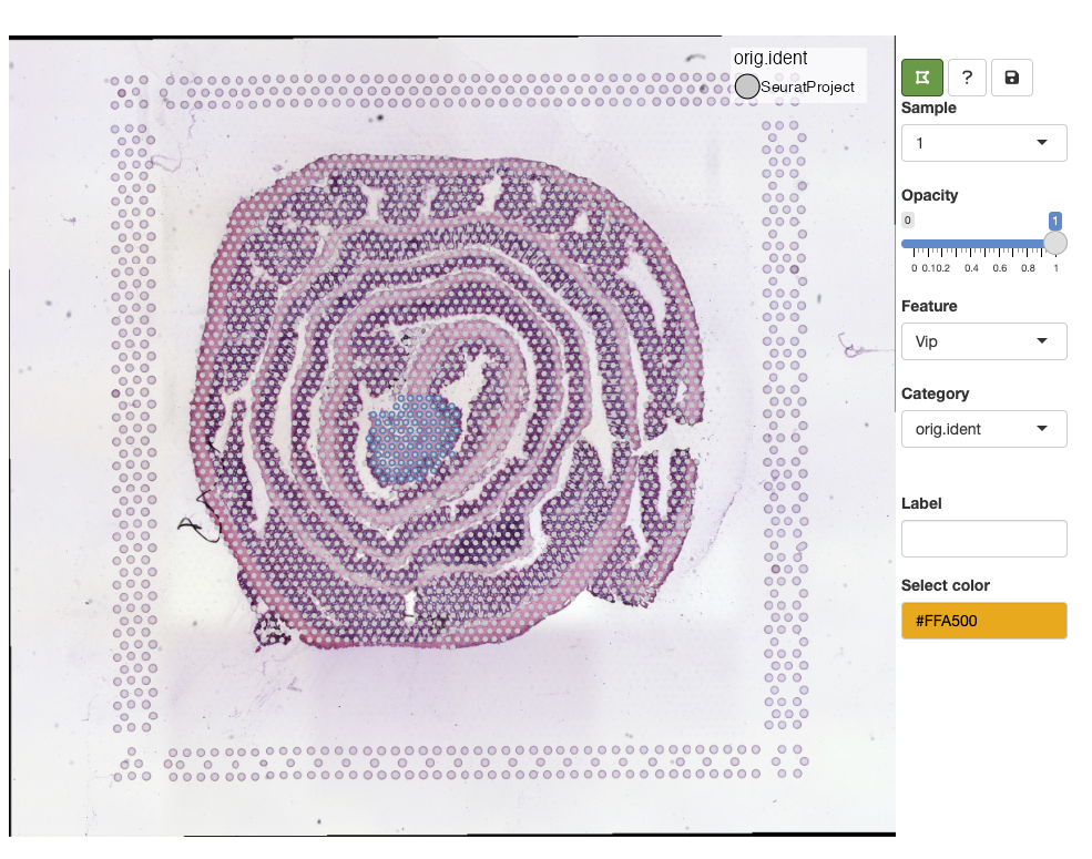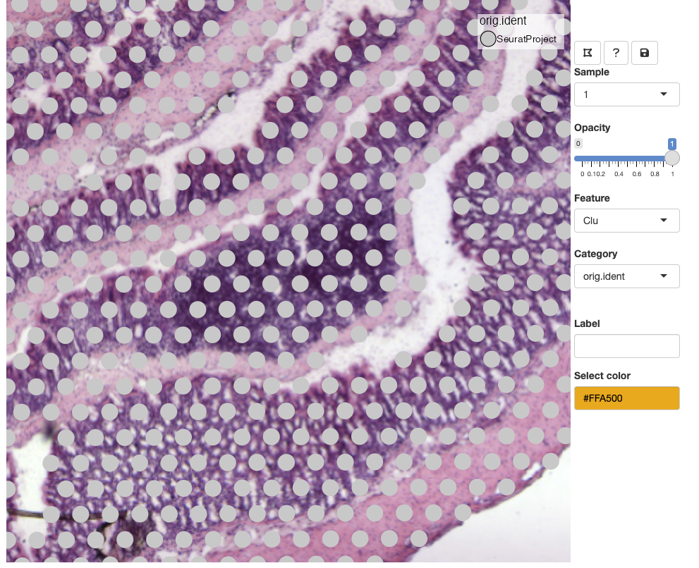 Having the option to interactively explore an SRT data set can be very useful. For example, a common task is to manually annotate spots based on morphological features of an H&E image which can only be done through an interactive application. Moreover, when we map gene expression to our H&E images in R, it is often difficult to associate their patterns with small morphological structures. At a quick glance, the expression of marker genes associated with small structures might appear random in plots, and it is only when we zoom in at the H&E image that we can see the tissues and cells that they are associated with.