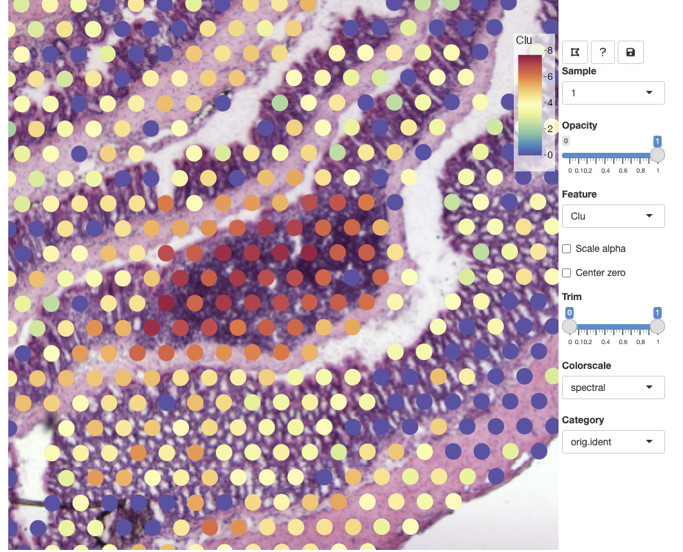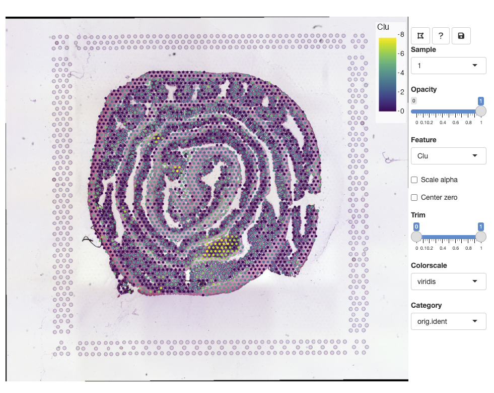 You can zoom in and out using the mouse wheel and pan by dragging clicking and dragging the H&E image. The opacity slider allows us to hide spots if we wish to view clear the view of the H&E image:
