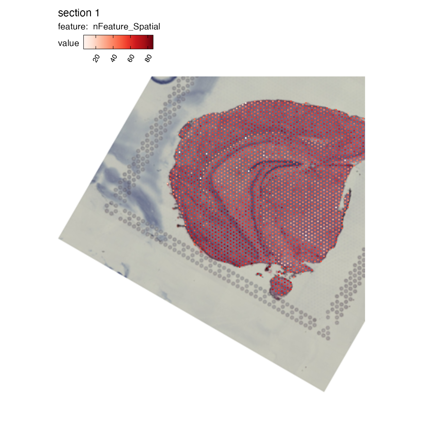 MapFeatures(se_mbrain, features = "nFeature_Spatial", image_use = "transformed")## Warning: Removed 27 rows containing missing values or values outside the scale range