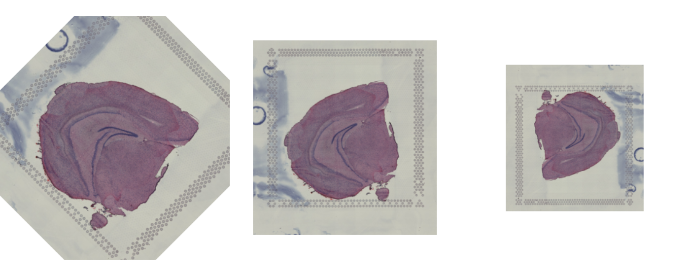 Here we will take a look at three H&E images with different orientations, and the goal is to align them to a common coordinate system.