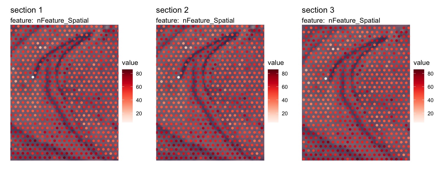 MapFeatures(se_merged, features = "nFeature_Spatial", image_use = "transformed", ncol = 3) &