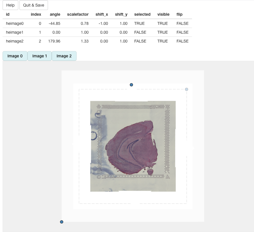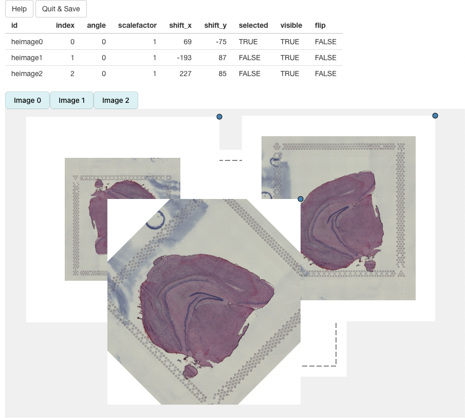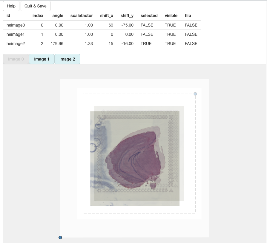 In the end, we should be able to get a decent alignment of the three H&E images. The table on top of the alignment panel shows the transformations that have been applied: