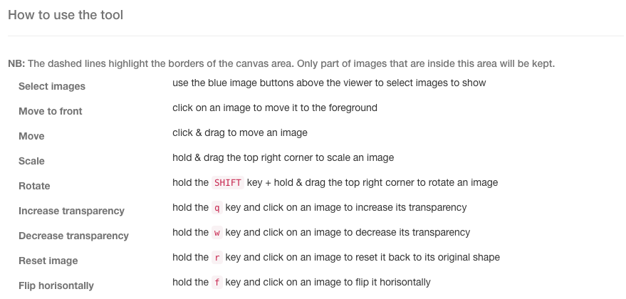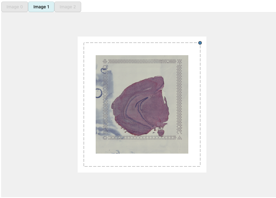 H&E images can be moved around by dragging the image with the cursor. The dotted borders around the H&E images highlights the dimensions of the ‘canvas’. Anything outside of these borders will be removed.