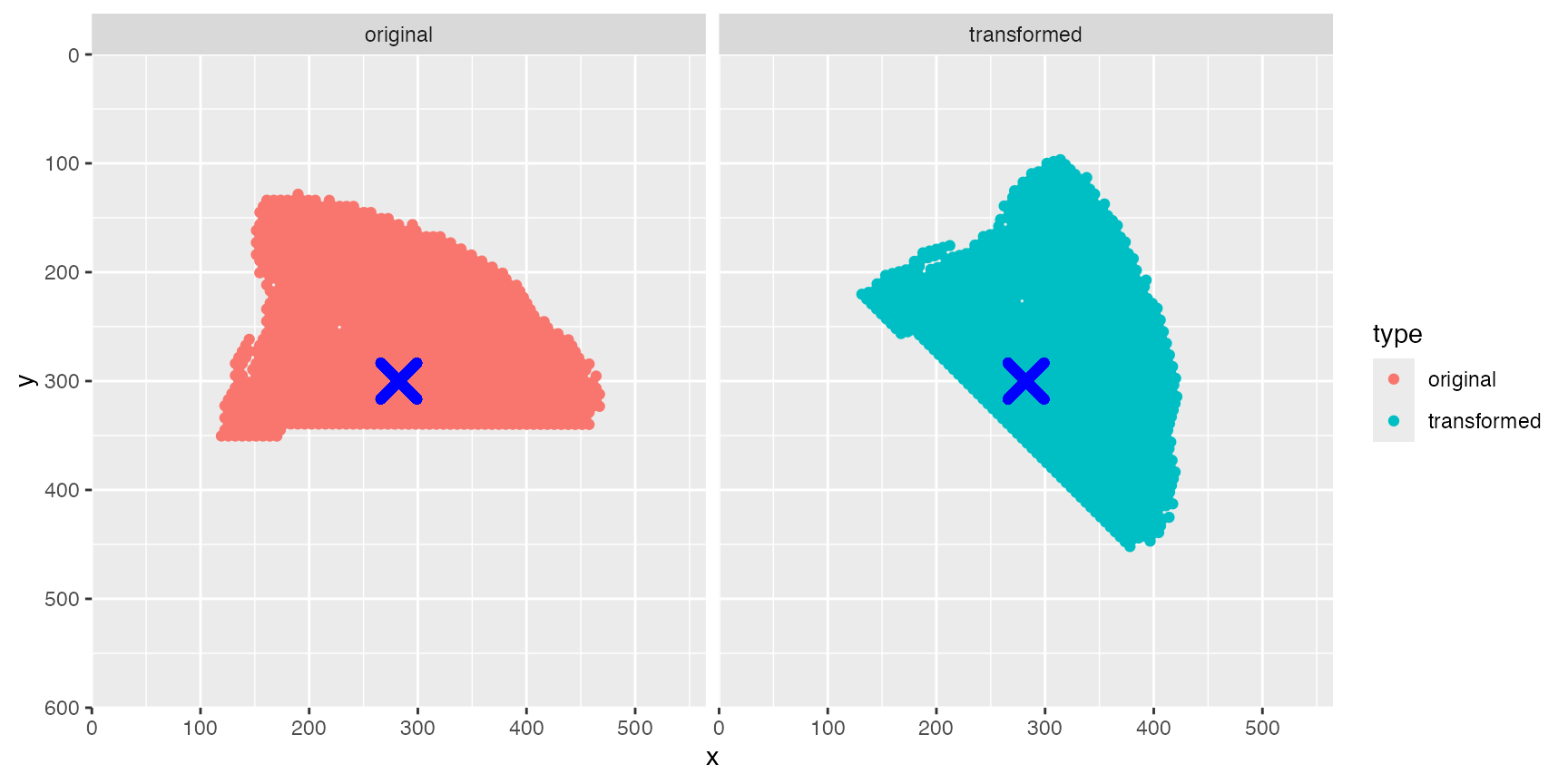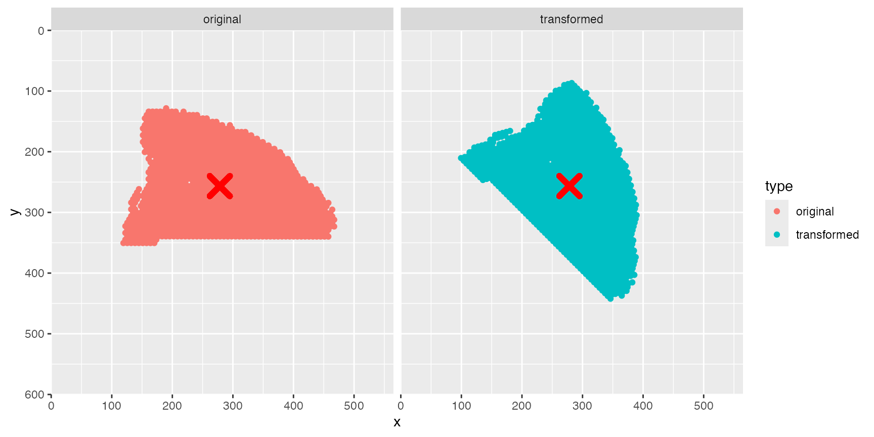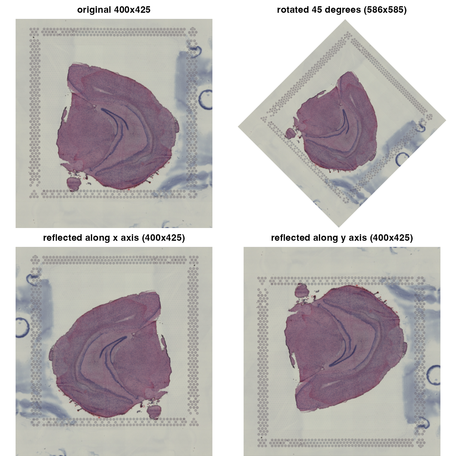 transf.res <- CoordAndImageTransform(im, xy_coords, angle = 45, mirror_x = TRUE)