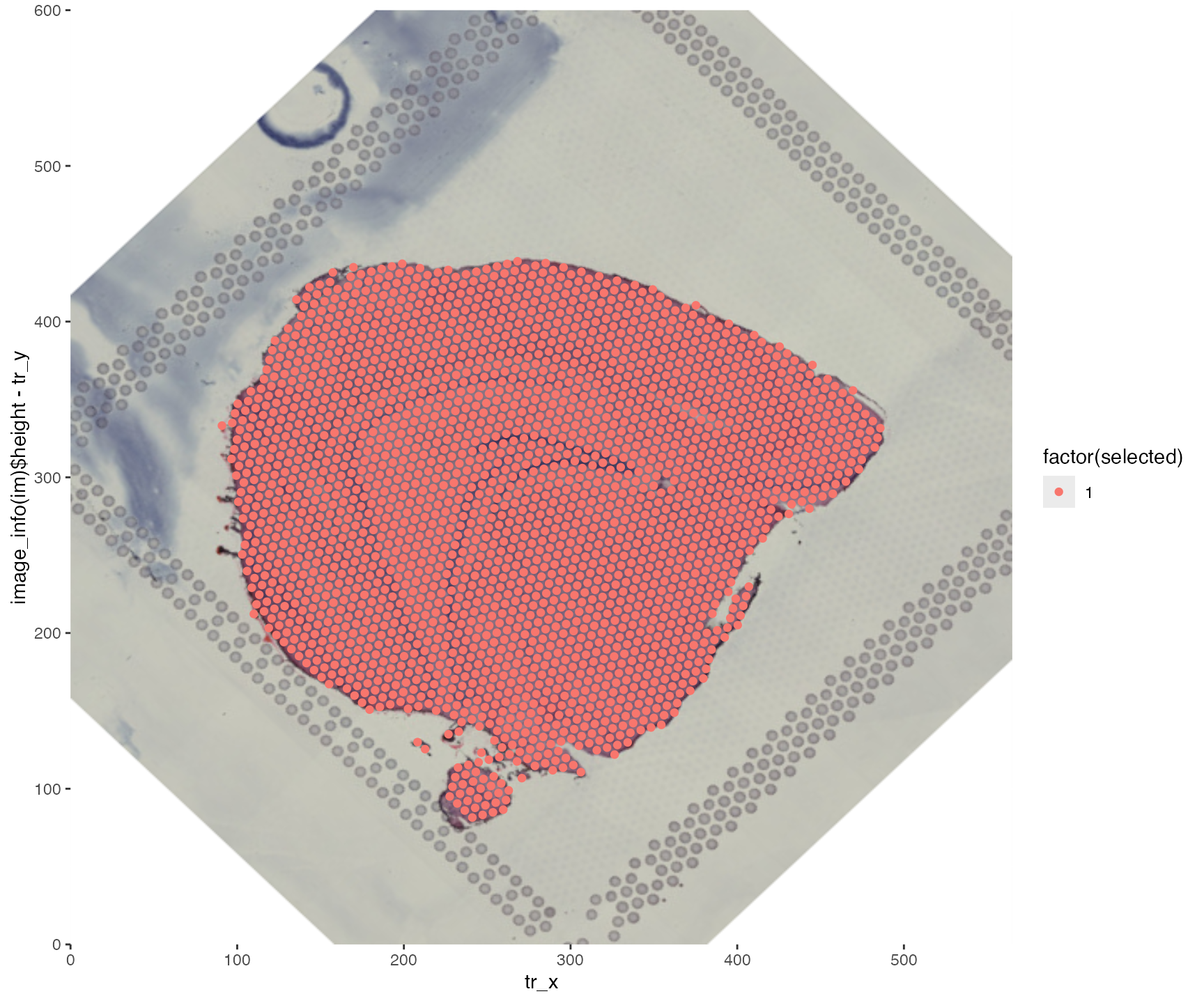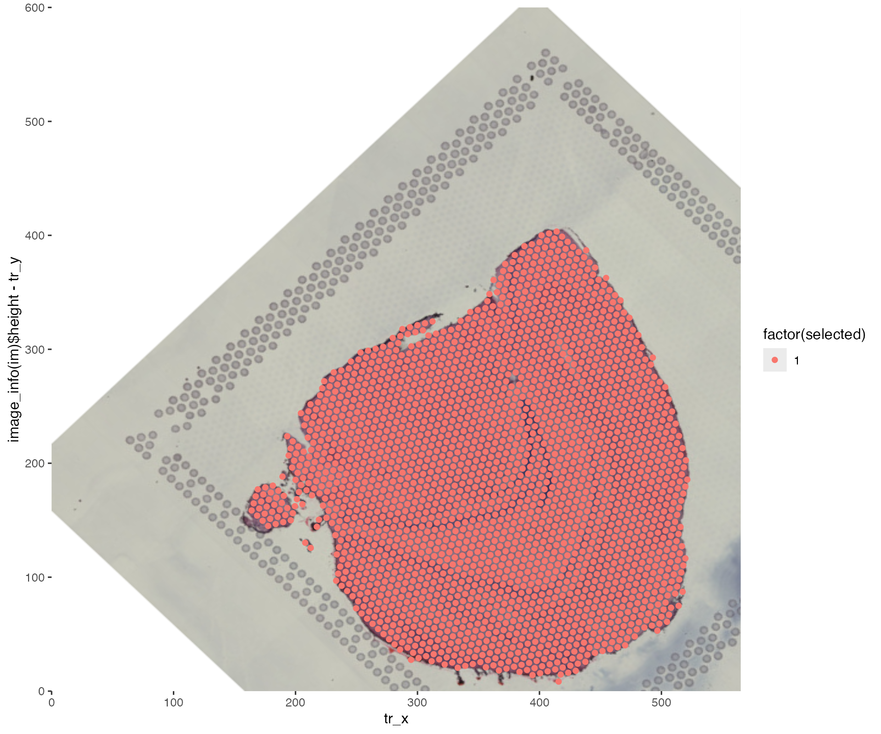 The spots are rotated around the center of our spots (red cross). Instead, we want to define a center to rotate the spots around, which will the the center of our H&E image.