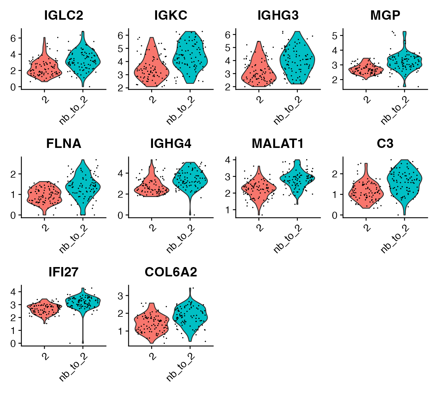 ident.2 = "2", group.by = "nb_to_2")## Warning: The `slot` argument of `GetAssayData()` is deprecated as of SeuratObject 5.0.0.