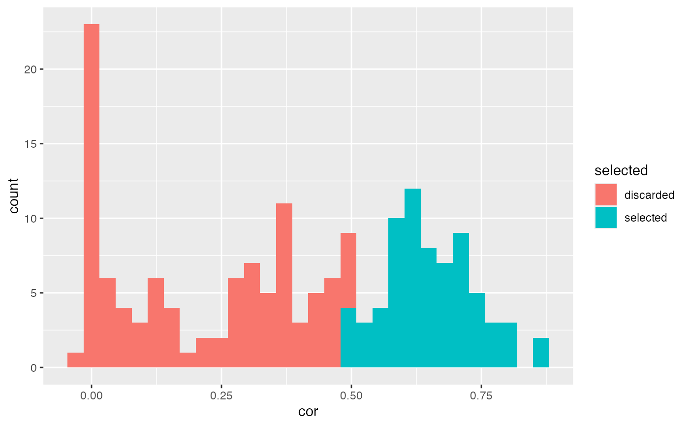 mutate(selected = ifelse(cor > 0.5, "selected", "discarded")) |>