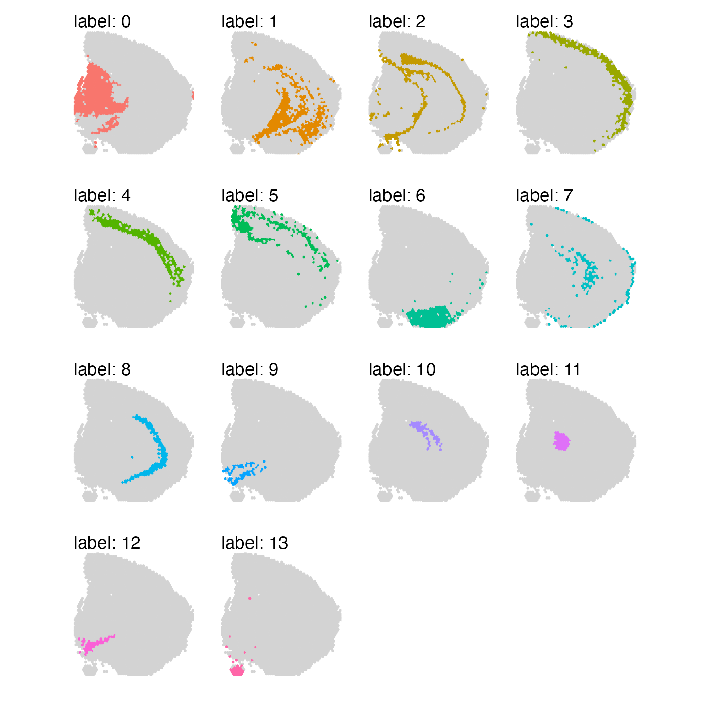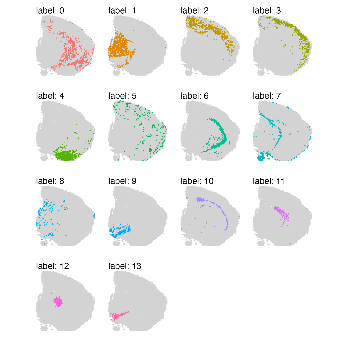 MapLabels(se_mbrain, column_name = "clusters_spatial_genes", split_labels = TRUE,