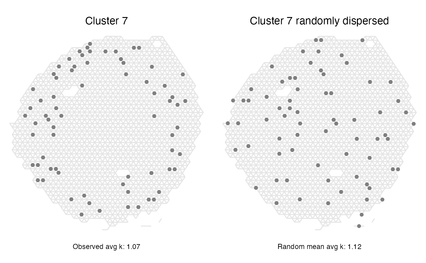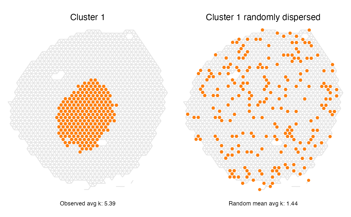 Now we can see that clusters 1 and 8 no longer have a positive enrichment, even if their spatial relationship is the same as when using the full data set. This is likely due to the large size of cluster 1 and that a large proportion of the total number of spots belong to this label, giving it a high likelihood of appearing next to spots of other labels when we randomly shuffle the labels.