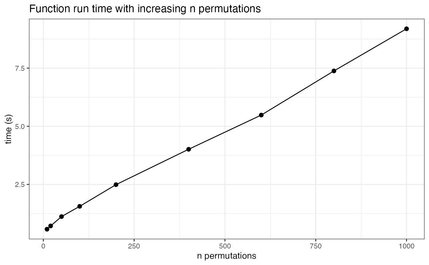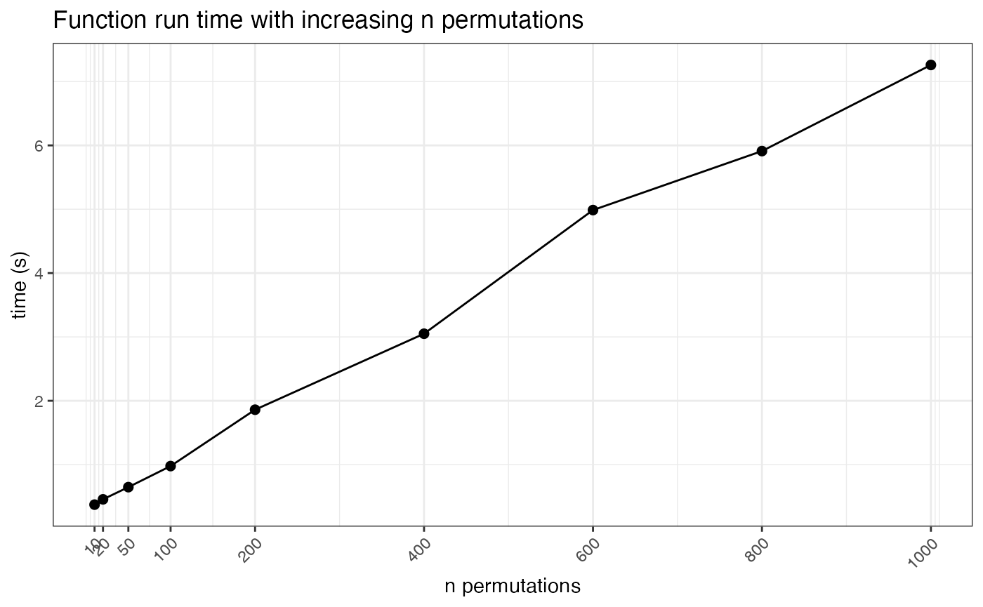 We can also here look at the run times of the function given increasing numbers of permutations used. This analysis runs relatively quick, so there is not much time loss for running the analysis with a large number of permutations.