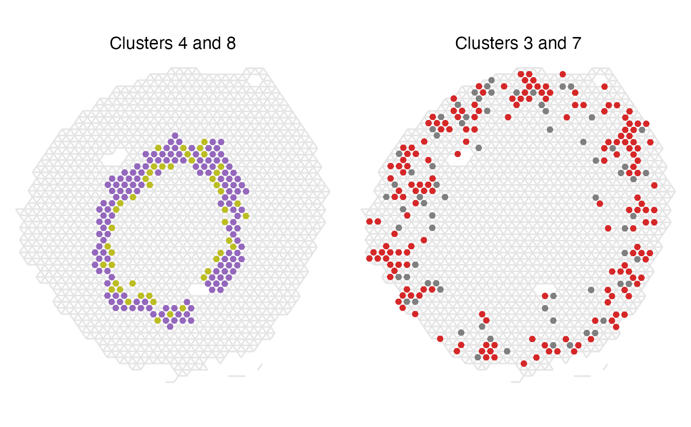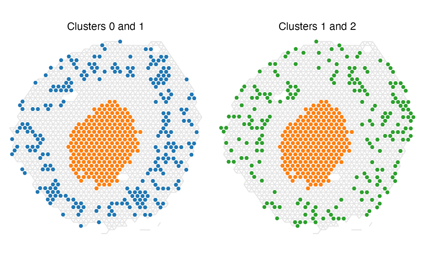 We can also plot these cluster pairs spatially to have a look if these results make sense. First, let’s look at the top two most over-represented label pairs.