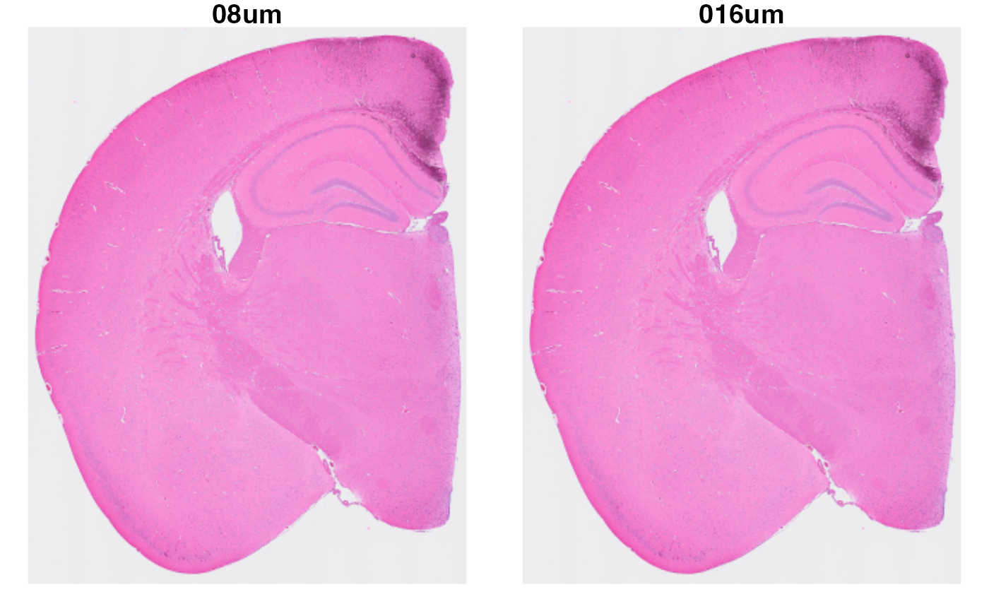 untar(paste0(targetdir, "mouse_brain_HD.tar.gz")As mentioned above, we can consider each resolution as its separate
