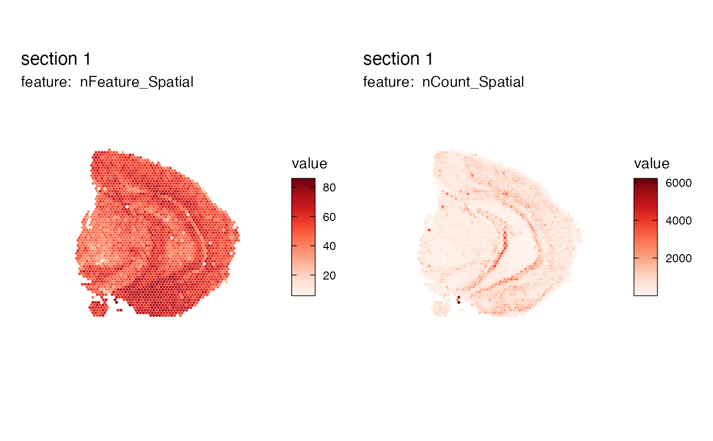 MapFeatures(se_mbrain, c("nFeature_Spatial", "nCount_Spatial")) &