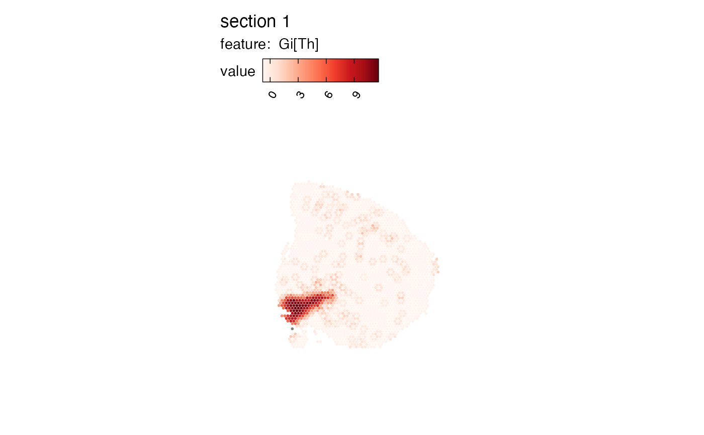 #> ℹ G scores will be named Gi[Ftr] and adjusted p-values will be named Pr(z != E(Gi[Ftr]))